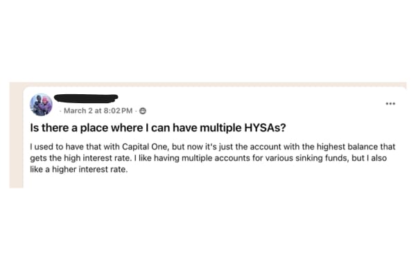 Question: Is there a place where I can have multiple HYSAs [for various sinking funds]?